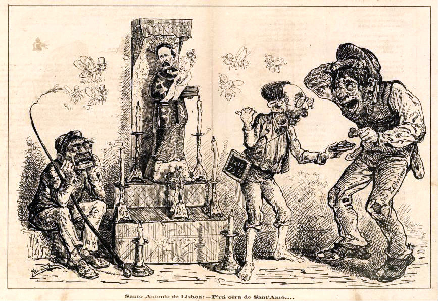O regime mudou, os atores são outros, mas a crítica de Bordalo continua plena de atualidade. No dia anterior ao do padroeiro lisboeta, as crianças faziam altares, os “tronos”, e pediam “um tostãozinho para o Santo António” que, evidentemente, ia para os seus próprios bolsos. No traço de Bordalo, quem pede é o ministro das Finanças sob o olhar atento do ministro das polícias e, no altar, o Santo António é Fontes Pereira de Melo, o primeiro-ministro, e o menino não é outro senão o rei. Mudem-se as personagens e a sátira podia ter sido desenhada nos dias de hoje. É essa a magia de Bordalo.