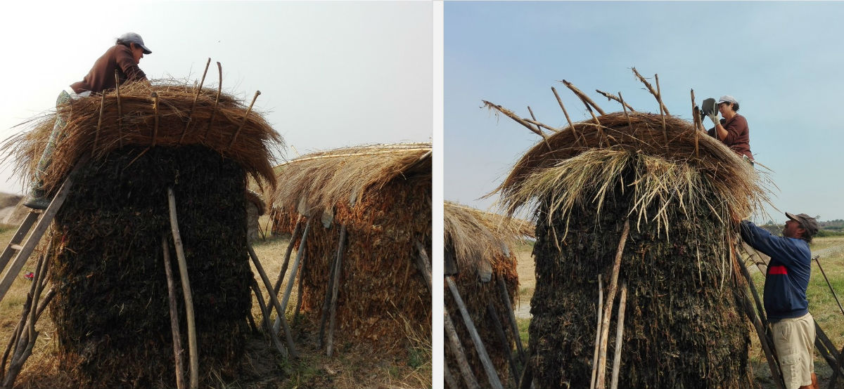 No final, quando o sargaço já se eleva a cerca de metro e meio, há que colocar os espetos de cana que irão sustentar o telhado que protegerá o palheiro da chuva. Esse é trabalho para Alberto. Com as estacas bem firmes perpendicularmente, Céu volta a subir para cima do palheiro e começa a construir o ‘cormo’, utilizando palha.
